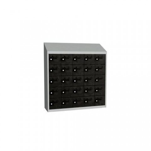 Svařované boxové skříně s malými schránkami na osobní věci vhodné do akvaparků a bazénů, na pracoviště nebo recepce hotelů. Jednotlivé schránky jsou samostatně uzamykatelné cylindrickým zámkem na klíč. Možnost umístění štítku se jménem nebo osobním číslem. Opatřeny horním šikmým nástavcem, otevírání dvířek až do úhlu 110°. Upevnění na zeď, vytvoření větších bloků spojením více skříní dohromady.Svařované skříně na osobní věci Olaf, 25 boxů, cylindrický zámek