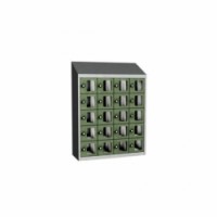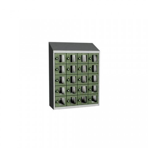 Svařované boxové skříně s malými schránkami s průzorem z plexiskla na osobní věci nebo ke skladování svačin a obědů. Jednotlivé schránky jsou samostatně uzamykatelné cylindrickým zámkem na klíč. Možnost umístění štítku se jménem nebo osobním číslem. Opatřeny horním šikmým nástavcem, otevírání dvířek až do úhlu 110°. Upevnění na zeď, vytvoření větších bloků spojením více skříní dohromady. Rozměry průzoru v x š - 117 x 95 mm.Svařované skříně na osobní věci Olaf s průhlednými dvířky, 20 boxů, cylindrický zámek
