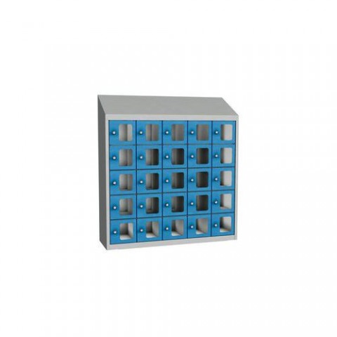 Svařované boxové skříně s malými schránkami s průzorem z plexiskla na osobní věci nebo ke skladování svačin a obědů. Jednotlivé schránky jsou samostatně uzamykatelné cylindrickým zámkem na klíč. Možnost umístění štítku se jménem nebo osobním číslem. Opatřeny horním šikmým nástavcem, otevírání dvířek až do úhlu 110°. Upevnění na zeď, vytvoření větších bloků spojením více skříní dohromady. Rozměry průzoru v x š - 117 x 95 mm.Svařované skříně na osobní věci Olaf s průhlednými dvířky, 25 boxů, cylindrický zámek