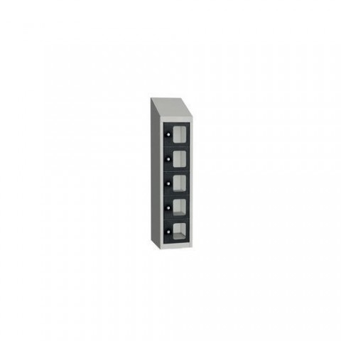 Svařované boxové skříně s malými schránkami s průzorem z plexiskla na osobní věci nebo ke skladování svačin a obědů. Jednotlivé schránky jsou samostatně uzamykatelné visacím zámkem. Možnost umístění štítku se jménem nebo osobním číslem. Opatřeny horním šikmým nástavcem, otevírání dvířek až do úhlu 110°. Upevnění na zeď, vytvoření větších bloků spojením více skříní dohromady. Rozměry průzoru v x š - 117 x 95 mm.Svařované skříně na osobní věci Olaf s průhlednými dvířky, 5 boxů, otočný uzávěr