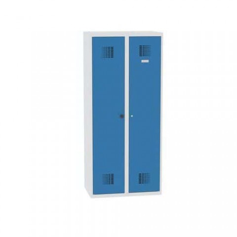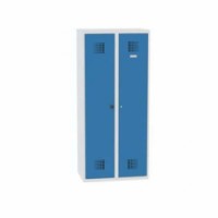 Svařované skříňky vhodné pro uložení úklidových pomůcek. Levé a pravé otevírání dveří umožňuje rychlý přístup do celé skříňky. Skříň je rozdělená na dva oddíly, z nichž jeden je vybaven čtyřmi policemi a druhý oddíl má jednu polici v horní části skříně. Vyrobené z ocelového plechu tl. 0,5 mm s vyztuženými svary. Účinné odvádění vlhkosti ventilačními otvory na dveřích skříně. Uzamykání na pravém křídle jednobodovým cylindrickým zámkem, levé křídlo má otevírání hliníkovým knoflíkem. Možnost umístění štítku se jménem v horní části dveří. Povrchová úprava práškovou barvou.Svařované úklidové skříně Chloe, 2 oddíly, šířka 800 mm, cylindrický zámek