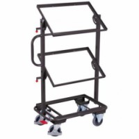 Ocelový vozík se dvěma nakloněnými policemi v úhlu 15° nebo 30 °. Do kovových rámů polic lze vsadit přepravky o rozměru 600 x 400 mm. Nosnost police je 50 kg. Pojízdnost zajišťují dvě pevná a dvě otočná kola z termoplastické pryže na plastovém ráfku s kuličkovými ložisky, nezanechávají stopy na podlaze.Vozíky na přepravky bez ložné plochy, se šikmými policemi, 3 police