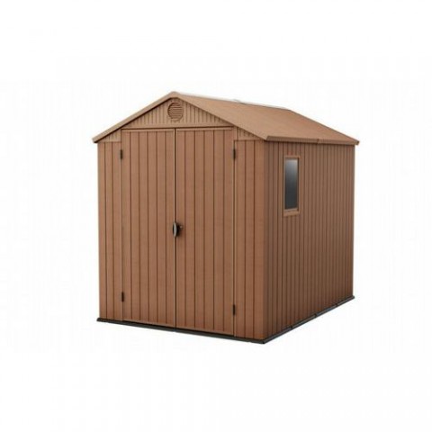 Bezúdržbové domky na nářadí, sekačky, kola, grily a jiná zařízení na zahradu. Robustní konstrukce s ocelovými výztuhami a dvojitými stěnami vyrobená z materiálu Evotech (dřevo-plast), který je velmi odolný vůči povětrnostním vlivům. Kvalitní podlahové panely udržuji nářadí a stroje v suchu a čistotě, lze uložit i těžší vybavení jako jsou sekačky či čtyřkolky aj. Dvojité široké dveře pro jednoduchou manipulaci se stroji. Postranní okno zajišťuje dostatek světla uvnitř domku. Pod střechou jsou umístěné větrací otvory pro cirkulaci vzduchu. Vnitřní rozměry jsou 212 x 234 x 174 cm.Zahradní domek Darwin 6 x 8, hnědý