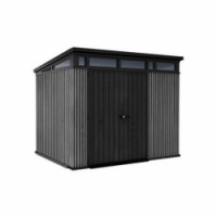 Bezúdržbový plastový zahradní domek Vertical je vyroben z jedinečného materiálu Decocoat, který je inspirován moderním vzhledem v imitaci dřeva. Domek má robustní konstrukci s dvojitými stěnami a kovové výztuhy. Vhodný na uschovávání nářadí a zahradních doplňků, ale také na sekačku nebo grill. Vybaven je širokými dvojitými dveřmi to rozměru 140 x 182 cm a podlahou pro náročné použití s nosností 150kg na m2. Zatížení střechy až 150 kg/m2, odolnost vůči větru do 145 km/hod (platí v případě ukotvení). Uživatelé určitě také ocení okno, světlíky a zajišťovací systém.Zahradní domek Vertical 9 x 7, šedý