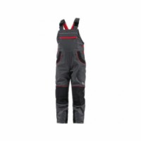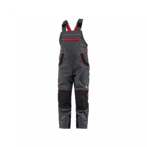 Dětské kalhoty s náprsenkou, z lehkého materiálu, náprsní kapsa na zip, boční zapínání na knoflíky, v zadní části guma s knoflíkem pro přizpůsobení velikosti, přední klínové kapsy, zadní jednoduchá kapsa, zesílená kolena, šle vzadu do gumy, reflexní doplňky. Velikost: 100-90 Svrchní materiál: 65 % polyester 35 % bavlna Reflexní doplňky: Ano OEKO-TEX® STANDARD 100: AnoZahradníky CXS PHOENIX CASPER, dětské, šedé s černými a červenými doplňky