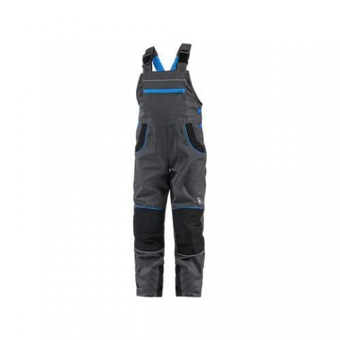 Dětské kalhoty s náprsenkou, z lehkého materiálu, náprsní kapsa na zip, boční zapínání na knoflíky, v zadní části guma s knoflíkem pro přizpůsobení velikosti, přední klínové kapsy, zadní jednoduchá kapsa, zesílená kolena, šle vzadu do gumy, reflexní doplňky. Velikost: 100-90 Svrchní materiál: 65 % polyester 35 % bavlna Reflexní doplňky: Ano OEKO-TEX® STANDARD 100: AnoZahradníky CXS PHOENIX CASPER, dětské, šedé s černými a modrými doplňky