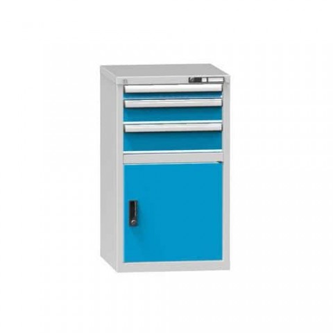 Zásuvková skříň je opatřená mechanismem centrálního zamykání a blokace zásuvek. Zásuvky jsou základním skladovacím prvkem, a proto splňují vysoké požadavky na pevnost a stabilitu. Korpusy zásuvkových skříní tvoří svařenec jednotlivých konstrukčních dílů z kvalitních ocelových plechů. Vnitřní konstrukce korpusů je opatřena perforací po 25 mm. Tuto perforaci využíváme k uchycení vodicích lišt zásuvek, jejich výškovému uspořádání a nakonfigurování požadované zásuvkové sestavy. Přestavování vodicích lišt nebo háčků polic probíhá jednoduše a velice rychle bez použití nástrojů.Zásuvkové skříně ZA2, 578 x 600 x 990 mm