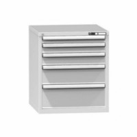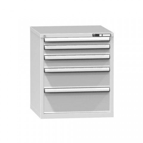 Zásuvková skříň je opatřená mechanismem centrálního zamykání a blokace zásuvek. Zásuvky jsou základním skladovacím prvkem, a proto splňují vysoké požadavky na pevnost a stabilitu. Korpusy zásuvkových skříní tvoří svařenec jednotlivých konstrukčních dílů z kvalitních ocelových plechů. Vnitřní konstrukce korpusů je opatřena perforací po 25 mm. Tuto perforaci využíváme k uchycení vodicích lišt zásuvek, jejich výškovému uspořádání a nakonfigurování požadované zásuvkové sestavy. Přestavování vodicích lišt nebo háčků polic probíhá jednoduše a velice rychle bez použití nástrojů.Zásuvkové skříně ZB5, 731 x 753 x 840 mm