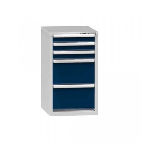 Zásuvková skříň je opatřená mechanismem centrálního zamykání a blokace zásuvek. Zásuvky jsou základním skladovacím prvkem, a proto splňují vysoké požadavky na pevnost a stabilitu. Korpusy zásuvkových skříní tvoří svařenec jednotlivých konstrukčních dílů z kvalitních ocelových plechů. Vnitřní konstrukce korpusů je opatřena perforací po 25 mm. Tuto perforaci využíváme k uchycení vodicích lišt zásuvek, jejich výškovému uspořádání a nakonfigurování požadované zásuvkové sestavy. Přestavování vodicích lišt nebo háčků polic probíhá jednoduše a velice rychle bez použití nástrojů.Zásuvkové skříně ZE3, 578 x 753 x 990 mm