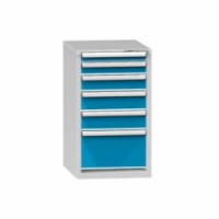 Zásuvková skříň je opatřená mechanismem centrálního zamykání a blokace zásuvek. Zásuvky jsou základním skladovacím prvkem, a proto splňují vysoké požadavky na pevnost a stabilitu. Korpusy zásuvkových skříní tvoří svařenec jednotlivých konstrukčních dílů z kvalitních ocelových plechů. Vnitřní konstrukce korpusů je opatřena perforací po 25 mm. Tuto perforaci využíváme k uchycení vodicích lišt zásuvek, jejich výškovému uspořádání a nakonfigurování požadované zásuvkové sestavy. Přestavování vodicích lišt nebo háčků polic probíhá jednoduše a velice rychle bez použití nástrojů.Zásuvkové skříně ZE4, 578 x 753 x 990 mm