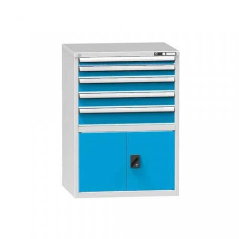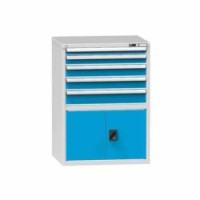Zásuvková skříň je opatřená mechanismem centrálního zamykání a blokace zásuvek. Zásuvky jsou základním skladovacím prvkem, a proto splňují vysoké požadavky na pevnost a stabilitu. Korpusy zásuvkových skříní tvoří svařenec jednotlivých konstrukčních dílů z kvalitních ocelových plechů. Vnitřní konstrukce korpusů je opatřena perforací po 25 mm. Tuto perforaci využíváme k uchycení vodicích lišt zásuvek, jejich výškovému uspořádání a nakonfigurování požadované zásuvkové sestavy. Přestavování vodicích lišt nebo háčků polic probíhá jednoduše a velice rychle bez použití nástrojů.Zásuvkové skříně ZK2, 884 x 753 x 1215 mm