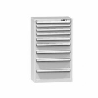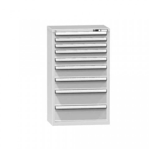 Zásuvková skříň je opatřená mechanismem centrálního zamykání a blokace zásuvek. Zásuvky jsou základním skladovacím prvkem, a proto splňují vysoké požadavky na pevnost a stabilitu. Korpusy zásuvkových skříní tvoří svařenec jednotlivých konstrukčních dílů z kvalitních ocelových plechů. Vnitřní konstrukce korpusů je opatřena perforací po 25 mm. Tuto perforaci využíváme k uchycení vodicích lišt zásuvek, jejich výškovému uspořádání a nakonfigurování požadované zásuvkové sestavy. Přestavování vodicích lišt nebo háčků polic probíhá jednoduše a velice rychle bez použití nástrojů.Zásuvkové skříně ZP4, 731 x 464 x 1215 mm