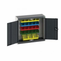 Závěsná kovová skříňka s perforací a sadou plastových boxů pro uložení nářadí. Perforovaný zadní panel skříňky pro zavěšení plastových boxů (typ louvre) a dvířka skříňky s perforovanou vnitřní stranou pro umístění držáků nářadí (typ perfo). Robustní svařovaná ocelová konstrukce s nosností až 1 tuna, povrchová úprava práškovým lakem. Zamykání cylindrickým zámkem se dvěma klíči. Sada 23 boxů obsahuje 20 x plastový box č. 2 (v x š x h) 8,3 x 10,3 x 16,5 cm: 5 x žlutý, 10 x červený, 5 x modrý a plastový box č. 3 (v x š x h) 12,5 x 14,5 x 24 cm: 3 x žlutý. Sada 33 boxů obsahuje 28 x plastový box č. 2 (v x š x h) 8,3 x 10,3 x 16,5 cm: 7 x žlutý, 7 x červený, 14 x modrý a plastový box č. 3 (v x š x h) 12,5 x 14,5 x 24 cm: 5 x žlutý. Sada 43 boxů obsahuje 28 x plastový box č. 2 (v x š x h) 8,3 x 10,3 x 16,5 cm: 7 x žlutý, 7 x červený, 14 x modrý a 15 x plastový box č. 3 (v x š x h) 12,5 x 14,5 x 24 cm: 5 x žlutý, 5 x červený, 5 x modrý.Závěsné skříňky Bott Cubio s boxy a perfopanely na nářadí