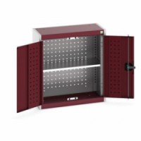 Závěsná kovová skříňka s perforovanou zadní stěnou a 1 policí. Zadní část skřínky a vnitřní část dveří jsou opatřeny perforovanými panely pro uchycení držáků nářadí (typ perfo). Pozinkovaná police výškově nastavitelná v rastru 25 mm. Robustní svařovaná ocelová konstrukce s nosností až do 1 tuny, povrchová úprava práškovým lakem. Zamykání cylindrickým zámkem se dvěma klíči. Plastové boxy a držáky nářadí nejsou součastí dodávky.Závěsné skříňky Bott Cubio s perfopanely, 1 police