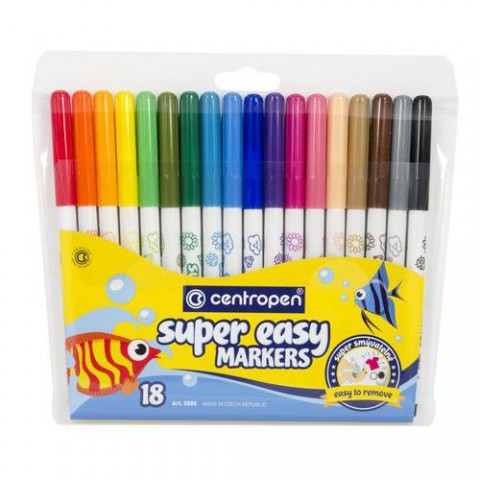 Sada popisovačů s ventilačním bezpečnostním chránítkem. Ergonomický úchop pro lepší držení. Zdravotně nezávadný, vypratelný inkoust na vodní bázi, který lze odstranit z kůže proudem vody. Válcové hroty jsou odolné proti zatlačení. Barvy jsou syté a zářivé. Praktické balení s eurozávěsem. Mix barev. Válcový hrot.Fix CENTROPEN sada 2580/18 barev SUPER EASY