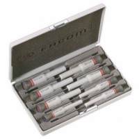 Zahrnuje: 5 šroubováků s drážkou: AEF.2x75 – AEF.2.5x75 – AEF.3x75 – AEF.3.5x75 – AEF.4x75. 3 šroubováky Phillips®: AEFP.00x75 – AEFP.0x75 – AEFP.1x75. Rozměry krabice: d. 205 x š. 130 x v. 31 mm. Hmotnost: 384 g.Sada 8 šroubováků Micro-Tech® s drážkou – Phillips®