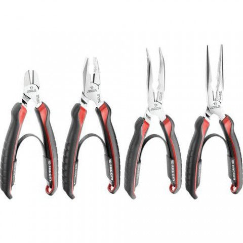 Standardní sada kleští Facom se 4 kusy. Mají širší rukojeť, které poskytují větší pohodlí uživatelům. V sadě jsou kombinované kleště, štípací kleště, kleště s dlouhými čelistmi, kulaté kleště. Celková délka: 160 mm, 180 mm, 200 mm.Sada kleští Facom, 4 ks