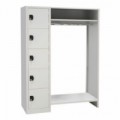 Víceúčelová šatní sestava pro odkládání osobních věcí a oděvů, určená do vnitřních prostor. Jedna část je tvořená pěti boxy, druhá je vybavená dvěma policemi a kovovou tyčí o délce 90 cm. Větrání boxů pomocí větracích otvorů na zadní straně. Dveře boxů jsou zavěšené na vnějších pantech a uzamykatelné cylindrickým zámkem.Kovové šatní sestavy Manutan Expert Rolland, 5 boxů