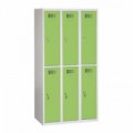 Šatní skříně s boxy v několika barevných variantách, vhodné pro odkládání osobních věcí zaměstnanců na pracovištích, v převlékárnách nebo sportovních klubech. Odlehčená konstrukce z ocelového plechu tloušťky 0,5 mm s výztuhami zajišťuje dobrou stabilitu. Účinné odvádění vlhkosti z oděvů větracími otvory na dveřích. Dvířka boxů jsou zavěšená na vnitřních pantech. Uzamykání každého boxu cylindrickým zámkem. Snadno udržovatelný hladký prostor uvnitř boxu. Možnost umístění štítku se jménem v horní části dveří.Svařované šatní skříně Jeff, 9 boxů, cylindrický zámek