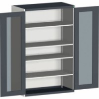 Kovové dílenské skříně s průhlednými plexi dveřmi pro snadnou kontrolu obsahu. Pozinkované police s nosností 100 kg, výškově nastavitelné v rastru 25 mm. Svařovaná ocelová konstrukce, povrchová úprava práškovým lakem. Uzamykání tříbodovým cylindrickým rozvorovým zámkem se dvěma klíči.Dílenské skříně s průhlednými dveřmi Bott Cubio, výška 200 cm