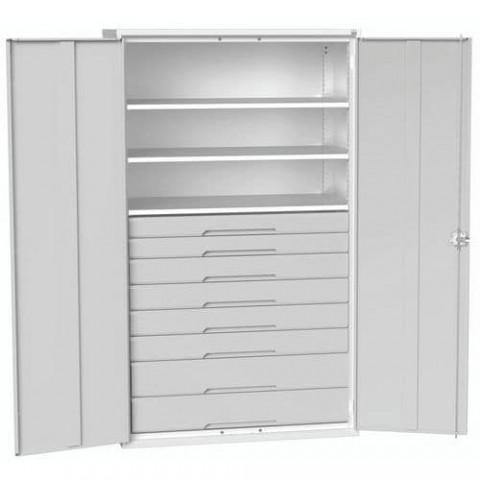 Kovové dílenské skříně vybaveny policemi a zásuvkami pro efektivní využití v provozech a dílnách. Svařovaná ocelová konstrukce, povrchová úprava práškovým lakem. Vyztužené křídlové dveře s tříbodovým cylindrickým rozvorovým zámkem se dvěma klíči. Pozinkované police s nosností 75 kg, výškově nastavitelné v rastru 25 mm. Zásuvky s nosností 75 kg a 100% výsuvem na válečkových ložiskách.Dílenské skříně se zásuvkami Bott Verso, výška 200 cm
