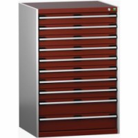 Zásuvkové skříně Bott Cubio se zásuvkami s nosností 200 kg a 100% výsuvy na válečkových ložiskách. Robustní svařovaná ocelová konstrukce s nosností až 1,5 tuny, povrchová úprava práškovým lakem. Systém centrálního zámku i blokace otevření více zásuvek najednou. Ergonomické rukojeti s popisovatelnou lištou, uzamykání cylindrickým zámkem se dvěma klíči.Dílenské zásuvkové skříně Bott Cubio 200, 120 x 80 x 65-75 cm, 10 zásuvek
