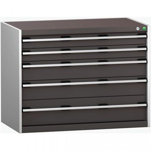Zásuvkové skříně Bott Cubio se zásuvkami s nosností 200 kg a 100% výsuvy na válečkových ložiskách. Robustní svařovaná ocelová konstrukce s nosností až 1,5 tuny, povrchová úprava práškovým lakem. Systém centrálního zámku i blokace otevření více zásuvek najednou. Ergonomické rukojeti s popisovatelnou lištou, uzamykání cylindrickým zámkem se dvěma klíči.Dílenské zásuvkové skříně Bott Cubio 200, 80 x 105 x 65-75 cm, 5 zásuvek