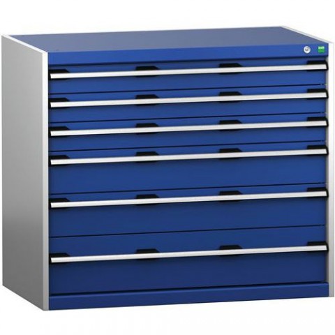 Zásuvkové skříně Bott Cubio se zásuvkami s nosností 200 kg a 100% výsuvy na válečkových ložiskách. Robustní svařovaná ocelová konstrukce s nosností až 1,5 tuny, povrchová úprava práškovým lakem. Systém centrálního zámku i blokace otevření více zásuvek najednou. Ergonomické rukojeti s popisovatelnou lištou, uzamykání cylindrickým zámkem se dvěma klíči.Dílenské zásuvkové skříně Bott Cubio 200, 90 x 105 x 65-75 cm, 6 zásuvek