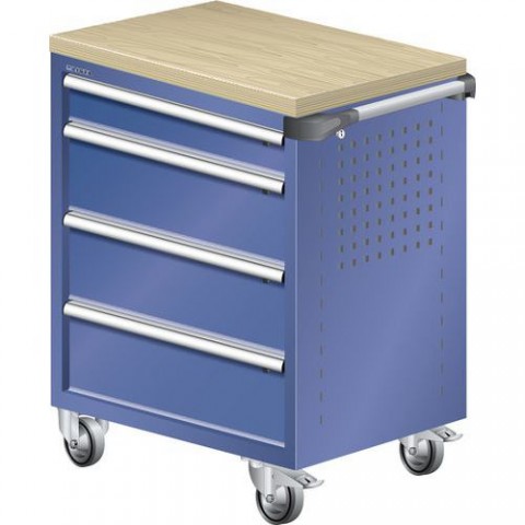 Dílenské zásuvkové vozíky LISTA, pracovní deska z multiplexní dýhy, 4 zásuvky Vybaven robustní dřevěnou deskou z multiplexní dýhy - 40mm, která je odolná a vhodná pro montáž svěráku Centrální zamykání KEY LOCK - vyměnitelné cylindrické vložky Pojistka, která brání samovolnému otevírání zásuvek Nosnost zásuvky 40kgDílenské zásuvkové vozíky LISTA, pracovní deska z multiplexní dýhy, 4 zásuvky