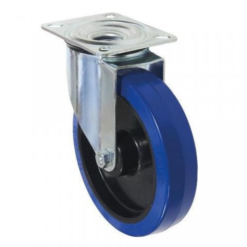 Otočná transportní kola s modrou pryžovou obručí. Bezhlučný provoz. typ kol: otočná materiál kol: guma průměr kola: 125 - 200 mm šířka kola: 36 - 50 mm nosnost: 150 - 220 kg způsob uchycení: vidlice s přírubou výška kola s vidlicí: 156 - 235 mm vyložení kola: 41 - 67 mm ložiska: valivá (jehličková) bezhlučný provoz, povrchová úprava pozinkovánímGumová transportní kola s přírubou, průměr 125 - 200 mm, otočná, valivá ložiska
