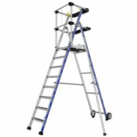 Pracovní plošiny Sherpamatic. Pevné 4stranné zábradlí s poloautomatickým zavíráním zadních zábradlí proti pádu. Protiskluzové schůdky 80 mm. Odnímatelný přihrádkový držák nářadí s nosností 25 kg, s integrovanými háčky (max. 10 kg). Výsuvné stabilizátory s milimetrovým nastavením. Vysoce komfortní protiskluzová podlaha 590 x 400 mm. Ergonomický a pohodlný pracovní prostor. Terénní pojezdová kola O175 mm.Hliníkové plošiny Sherpamatic Tubesca-Comabi
