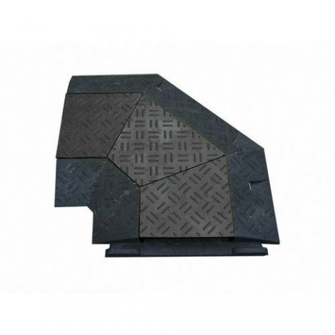 Pravé provedení rohového přejezdu s horním víkem k ochraně kabelů, hadic a trubek, které je nutné vést přes vozovku. Vhodné k použití ve výrobních provozech, pozemních komunikacích, při pořádání kulturních akcí a podobně. Spojení jednotlivých dílů pomocí jednoduchých zámků na konci mostu.Kabelové mosty s krytem, rohové, pravé provedení