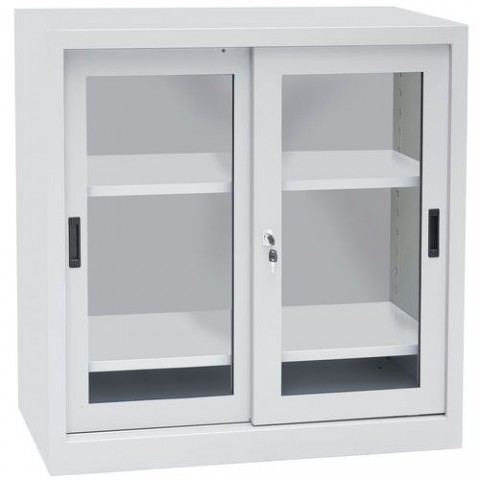 Nízké kovové skříně s prosklenými posuvnými dveřmi jsou vhodné do kanceláří, laboratoří, dílenský pracovišť i zdravotních zařízení. Skříňky s konstrukcí z ocelového plechu je vybavena dvěma policemi, jejichž výšku lze podle potřeby nastavit. Tvrzené sklo o tloušťce 4 mm. Dveře jsou uzamykatelné cylindrickým zámkem.Kovové dílenské skříně Manutan Expert, 100 x 100 x 45 cm
