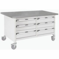 Dílenské stoly Bott Cubio Storage s pracovní deskou tl. 4 cm typu multiplex nebo linoleum. Nosnost až 300 kg, robustní svařovaná ocelová konstrukce, povrchová úprava práškovým lakem. Centrálně uzamykatelné zásuvky s výškou 4 x 15 a 2 x 20 cm, nosností 75 kg a 100% výsuvem na válečkových ložiskách. Dvě pevná a dvě otočná kola s brzdou o průměru 12,5 cm.Mobilní dílenský stůl Bott Cubio Storage, 84 x 150 x 75 cm, 6 zásuvek, multiplex/linoleum