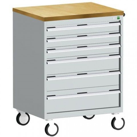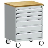 Mobilní zásuvkové skříně Bott Cubio s horní pracovní plochou tloušťky 2 cm typu multiplex/linoleum nebo ohraněný plech s rohoží. Nosnost až 600 kg, robustní svařovaná ocelová konstrukce, povrchová úprava práškovým lakem. Centrálně uzamykatelné zásuvky s výškou 3 x 10, 2 x 15 a 1 x 20 cm, nosností 50 kg a 100% výsuvem na válečkových ložiskách. Ergonomické rukojeti zásuvek s popisovatelnou lištou, systém blokace otevření více zásuvek najednou. Dvě pevná a dvě otočná kola s brzdou o průměru 12,5 cm.Mobilní zásuvková skříň Bott Cubio, 109 x 80 x 65 cm, 6 zásuvek, multiplex/linoleum/rohož