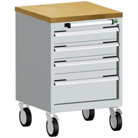 Mobilní zásuvkové skříně Bott Cubio s horní pracovní plochou tloušťky 2 cm typu multiplex/linoleum nebo ohraněný plech s rohoží. Nosnost až 300 kg, robustní svařovaná ocelová konstrukce, povrchová úprava práškovým lakem. Centrálně uzamykatelné zásuvky s výškou 3 x 10 a 1 x 20 cm, nosností 50 kg a 100% výsuvem na válečkových ložiskách. Ergonomické rukojeti zásuvek s popisovatelnou lištou, systém blokace otevření více zásuvek najednou. Dvě pevná a dvě otočná kola s brzdou o průměru 12,5 cm.Mobilní zásuvková skříň Bott Cubio, 79 x 52,5 x 52,5 cm, 4 zásuvky, multiplex/linoleum/rohož