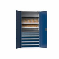 NC skříně jsou opatřeny dvojitými stěnami s perforací pro zavěšení polic, nosičů, nástrojových rámů a zásuvek. V případě vybavení skříne zásuvkami je standardně, z důvodu bezpečnosti (nebezpečí převrácení), dodávána blokace proti vysunutí více zásuvek. Korpus skříně se uzavírá křídlovými dveřmi s panty otočnými o 180°. Zamykání cylindrickým rozvorovým zámkem. Standardní výbavou je systém identifikace otvorů a popisový štítek s funkcí chytrý nábytek. Do skříní je možné zavěšovat zásuvky s půdorysem ZC (54x27).NC skříně s křídlovými dveřmi 54x27D s vybavením, var. 12