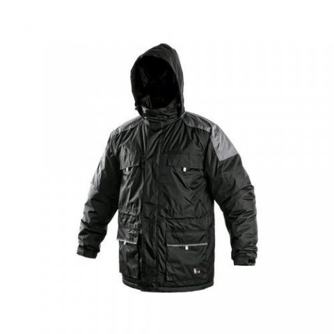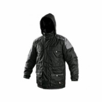 Černá pánská zateplená bunda s kapucí s šedými doplňky. Náprsní a přední kapsy na zip kryté légou. Pohodlnější nošení zajišťuje zakončení rukávů regulovatelnou manžetou a možnost stažení v pase. Odolná proti vodě, lepené švy. Kryté zapínání na zip k bradě.Pánská zimní bunda CXS, černá/šedá