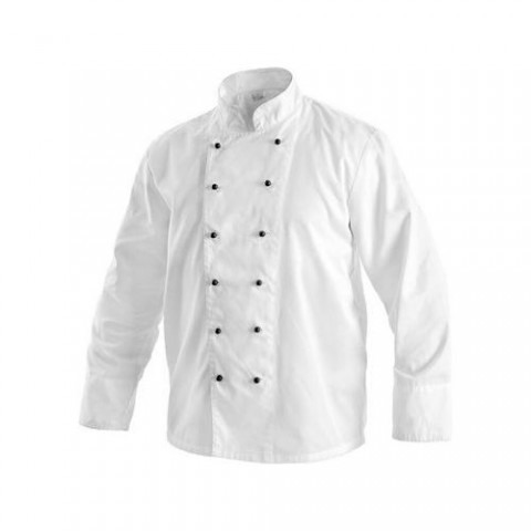 Bílý kuchařský rondon s dlouhým rukávem a zapínáním ve dvou řadách. velikost: 42 - 64 provedení: pánské materiál: 100% bavlna, kepr gramáž: 190 g/m2 barva: bílá certifikace: EN ISO 13688Pánský kuchařský rondon dvouřadý