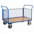 Manipulační vozík s pevnou ocelovou konstrukcí, velkou ložnou plochou a dvěma mřížovými stěnami. Stěny z ocelových trubek jsou vysoké 72 cm a lze je jednoduše našroubovat. Ložná plocha je vyrobena z laminované dřevotřísky. Pohyb zajišťují čtyři dušová kola s valivými jehlovými ložisky, z nichž dvě jsou pevná a dvě otočná. Kola jsou široká 85 mm a jsou vybavena ochrannými kryty. Zvednutím táhla dojde k zabrzdění předních otočných kol. Povrchová úprava práškovým lakem. Vozíky lze dodat i v atypickém provedení nebo jiné barvě.Ruční plošinový vůz se dvěma stěnami s mřížovou výplní, do 600 kg