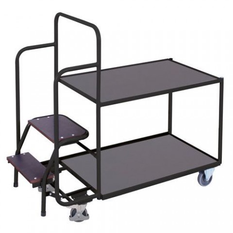 Policový vozík se dvěma policemi a praktickými schůdky. Schůdky umožňují vystoupit do výšky 51,5 cm nad podlahu. Police vyrobené z MDF desek jsou zasazené do rámu ocelové konstrukce. Pojezd zajišťují čtyři kola s valivými kuličkovými ložisky, z nich dvě jsou otočná s brzdou a opatřená ochrannými kryty.Policové vozíky se schůdky, do 250 kg, 2 police