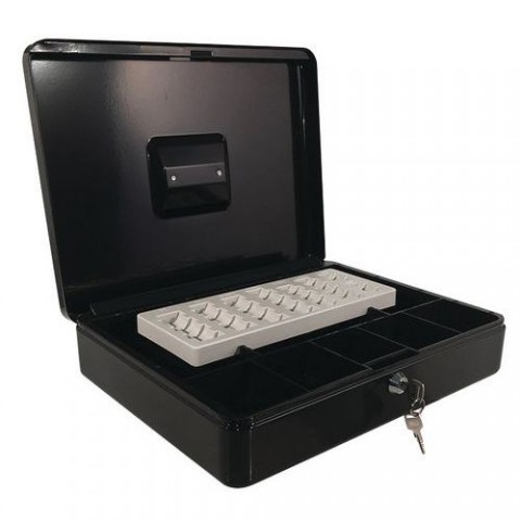 Příruční kovové pokladny v různých barevných variantách s horním úchytem. Obsahují vyjímatelný dělič se třemi přihrádkami a euromincovník (1, 2 eura, 1, 2, 5, 10, 20 a 50 centů). barva: modrá, černá, červená materiál: ocel rozměry v x š x h: 95 x 370 x 285 mm zámek: cylindrický (2 klíče)Přenosné pokladny s EUR mincovníkem, 9 přihrádek