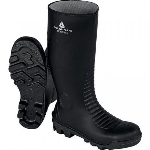 Svršek: PVC. Podšívka: polyester. Ochrana malleolu. Uvolňovací výstupek. Ochranný hrot: nerezová ocel. Antiperforační podrážka: nerezová ocel. Podešev: PVC - Nitril s velkými cvočky.S5 SRA PVC bezpečnostní boty - Černá - Delta Plus