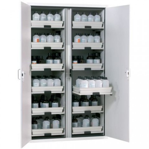 Vhodné pro bezpečné a předpisové skladování agresivních, nehořlavých látek. Robustní skříň s bezpečnostními prvky mimo skladovací oddíly pro zvýšení odolnosti proti korozi i jednoduché čištění. Dva hermeticky oddělené skladovací oddíly v jedné skříni např. pro skladování kyselin a louhů. Na vysouvatelných policích jsou umístěny polypropylenové vaničky. Integravovaná nekovová přípojka k externímu větracímu systému. Patky pro vyrovnání nerovností podlahy. Uzamykání celé skříňky centrálním zámkem. Konstrukce a dveře z ocelového plechu s povrchovou úpravou práškovým lakem v barvě šedá RAL 7035 nebo bílá RAL 9016. Nosnost jedné police je 25 kg.Skříně na žíraviny, 1965 x 1197 x 603 mm, PP, 2 oddíly