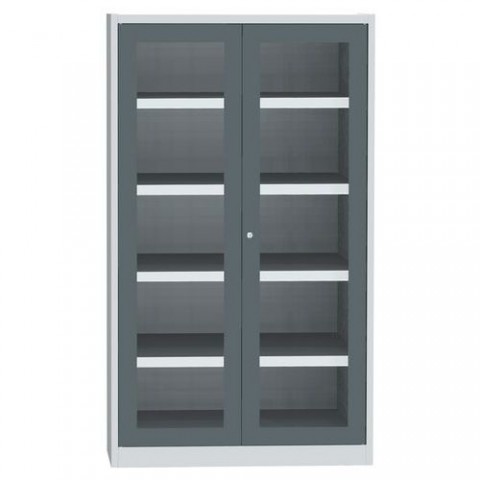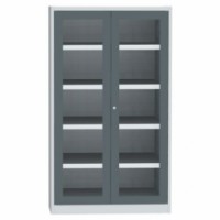 Skříně slouží k uložení chemických látek ve vlastním obalu. Uložené kapaliny stojí na roštu a tím nezmenšují záchytný objem polic. Skříň obsahuje 4 záchytné police s roštem o záchytném objemu 19 l na polici a spodní záchytnou vanu bez roštu o objemu 20 l. Dvoubodové uzamykání cylindrickým zámkem na klíč. Prosklené dveře uložené na vnitřních čepech lze otevřít do úhlu 110°. Povrchová úprava konstrukce práškovým lakem v barvě RAL. Kalené sklo tlošťky 4 cm.Skříně se skleněnými dveřmi na uskladnění chemikálií, 1950 x 1200 x 500 mm
