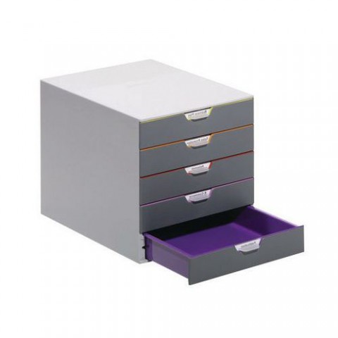 Modul s 5 zásuvkami pro archivaci dokumentů formátu A4, folio a obálky. Optimální organizace díky barevnému kódování. Zásuvky vybavené zarážkami. Stohovatelné a vedle sebe složitelné moduly. Protiskluzové podložky.Spisový modul Varicolor - 5 zásuvek