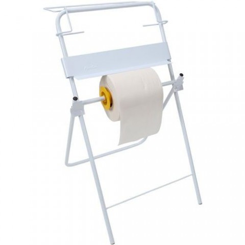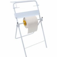 Volně stojící skládací kovový stojan na průmyslové utěrky v rolích. Odtrhávání útržků usnadňuje kovová nastavitelná lišta. Plastové zarážky pro pevné uchycení role. Určené pro role o maximálním průměru 35 cm.Stojan na průmyslové utěrky Manutan Expert Ralf s držákem na pytle na odpad