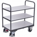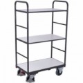 Antistatický policový vozík se třemi policemi. Ložná plocha z elektricky vodivé laminátové dřevotřísky. Police jsou vsazené do ocelového rámu a lze je vyjímat. 2 pevná a 2 otočná kola s brzdou EasySTOP. Šedá kola z termoplastické pryže nezanechávající stopy na plastovém ráfku s přesnými kuličkovými ložisky.Policové vozíky ESD, 3 police, do 250 kg