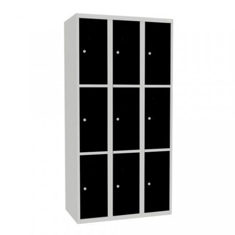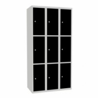 Šatní skříně s boxy v několika barevných variantách, vhodné pro odkládání osobních věcí zaměstnanců na pracovištích, v převlékárnách nebo sportovních klubech. Odlehčená konstrukce z ocelového plechu tloušťky 0,5 mm s výztuhami zajišťuje dobrou stabilitu. Účinné odvádění vlhkosti z oděvů větracími otvory na dveřích. Dvířka boxů jsou zavěšená na vnitřních pantech. Uzamykání každého boxu cylindrickým zámkem. Snadno udržovatelný hladký prostor uvnitř boxu. Možnost umístění štítku se jménem v horní části dveří.Svařované šatní skříně Jeff, 9 boxů, cylindrický zámek