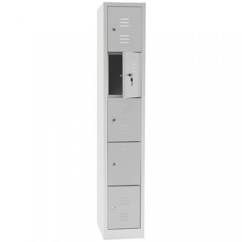 Kovové šatní skříňky s pěti boxy vhodné pro odkládání osobních věcí zaměstnanců a návštěvníků. Účinné odvádění vlhkosti z oděvů větracími otvory na dvířkách boxů. Dveře boxů jsou vyztužené a zavěšené na vnitřních pantech. Skříňku je možné připevnit ke zdi pomocí předvrtaných otvorů na zadní straně. Možnost umístění štítku se jménem v horní části dveří.Svařované šatní skříně Manutan Expert Landry, 5 boxů, bez zámku